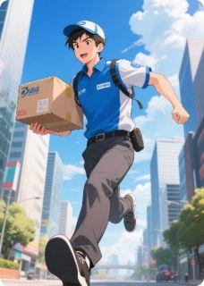 肩上还搭着印着快递公司logo的帆布包,站在巨大的落地窗前,
